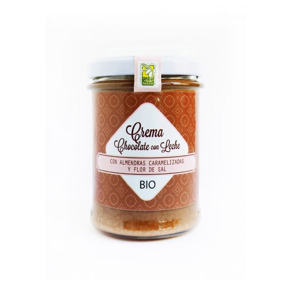 Crema para untar BIO y de Comercio Justo de chocolate con leche, almendras caramelizadas y flor de sal.