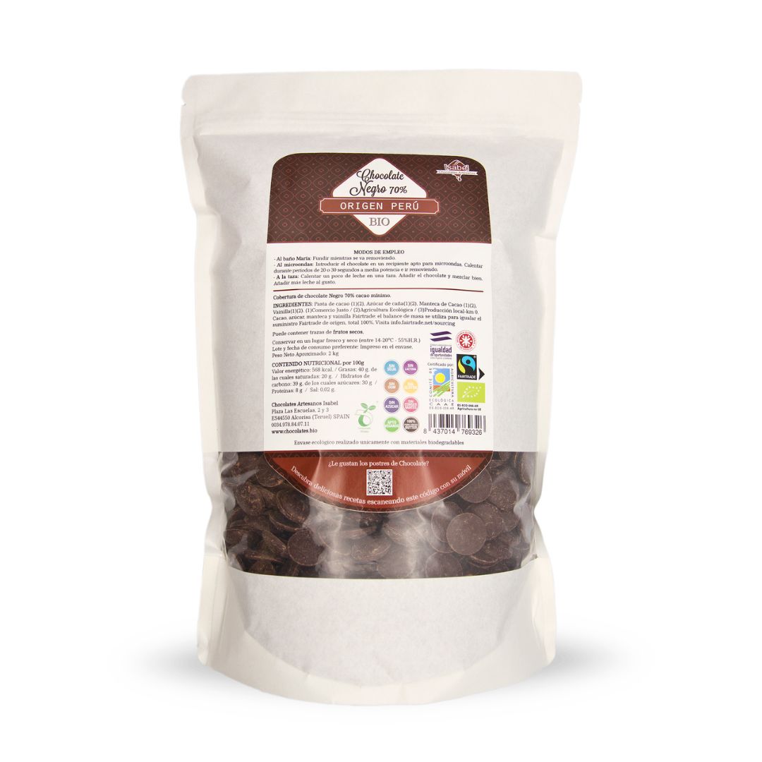Cobertura de chocolate negro BIO y Fairtrade, 70% cacao, sin soja. Apto dieta vegana.