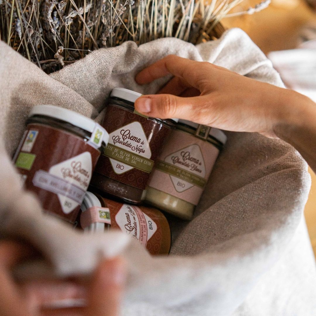 Crema para untar BIO y de Comercio Justo de chocolate Negro con Aceite de Oliva Virgen Extra (variedad Empeltre) y Flor de sal de Añana.